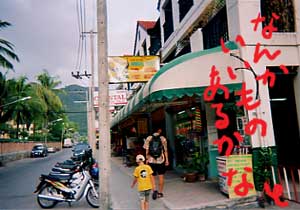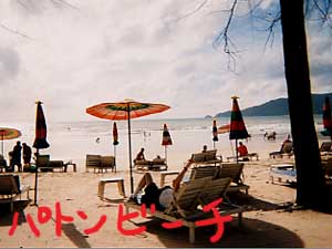 それでもなんとか無事に「トムヤム君」乗り込んだ一行は一路「パトンビーチ」へ。ここはプ−ケット島の観光スポットらしい。アメ横みたいな小さな店が立ち並び、ビーチでは海水浴に興じる人々。なんとここでスタバを発見!日本で入ったことなくて異国の地で初めてスタバ経験!おいしかった!!ビーチで遊んでるとパラセイリングに誘う地元のお兄さんたち。昨日やったからいいよと断っても片言の日本語で話しかけてくる。知り合いの先生に似てたのでついつい相手をしてしまう。日本語上手ですねと言うと、「もっと知ってるよ!『オカマ』!」と言う。知る人ぞ知る、タイはおかまショーのメッカなのでした。 |
