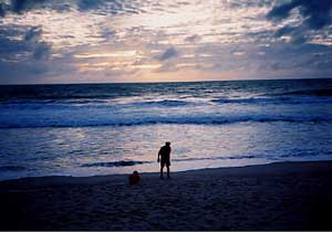 シャトルボートに乗ってラグーナビーチホテルへ。湖をすいすい(?)走るボート。ホテルのプールは滑り台やら噴水やらそれぞれに趣向が凝らしてあって面白い。ビーチに出るとすごい大きな波。今は雨季なのでホテルの前の海は波が荒くて泳げないそうだ。だけど砂浜は風が気持ちいい。波の音ってどうしてこんなに落ち着くんだろ。 |
